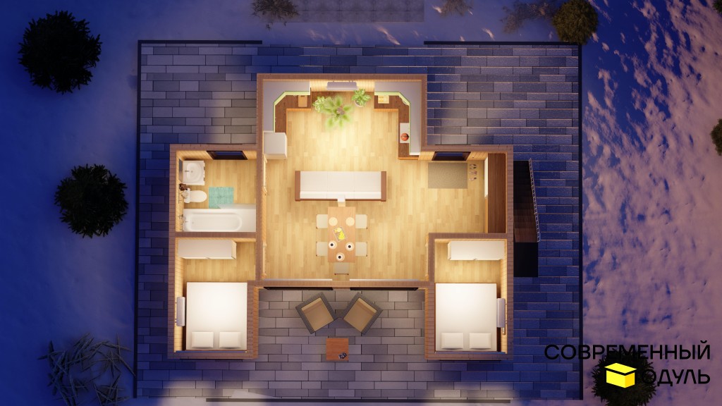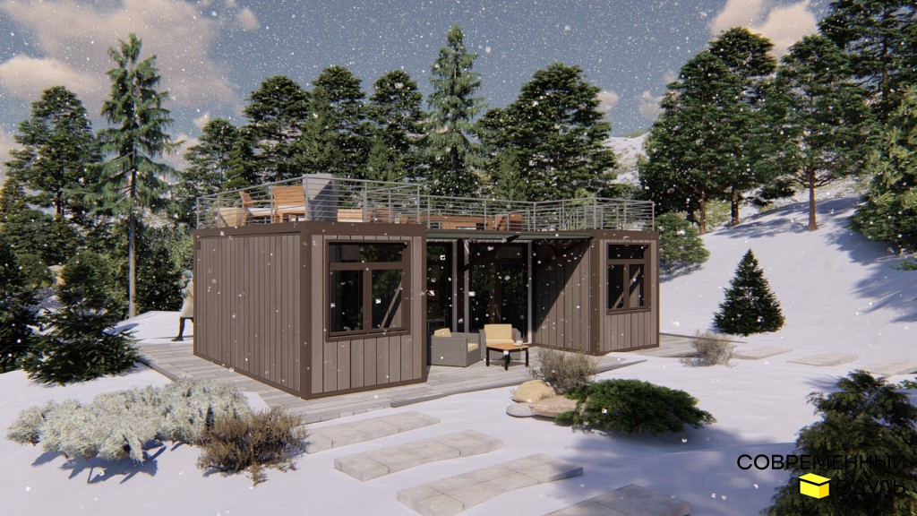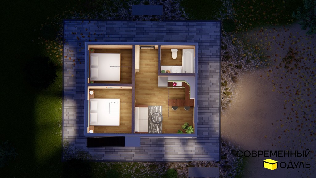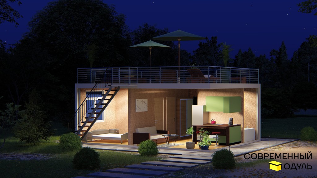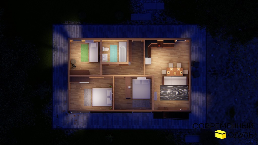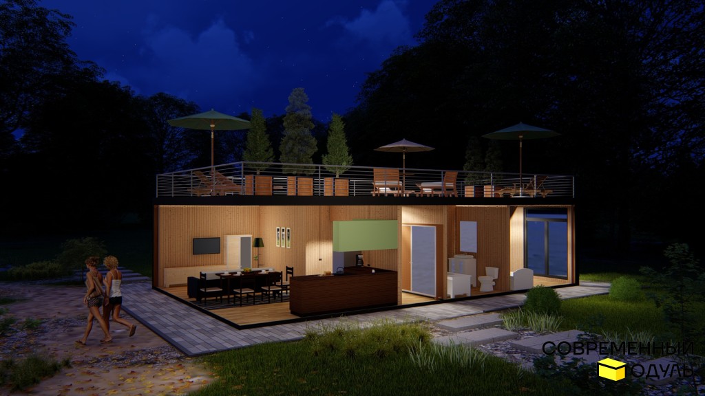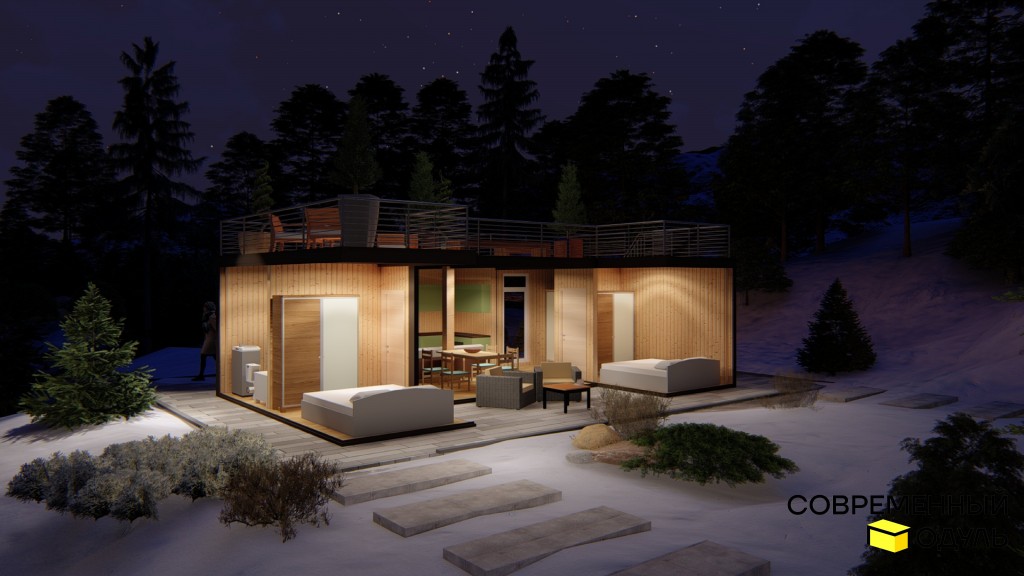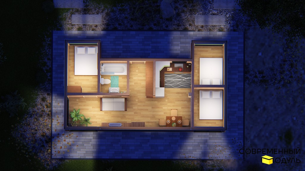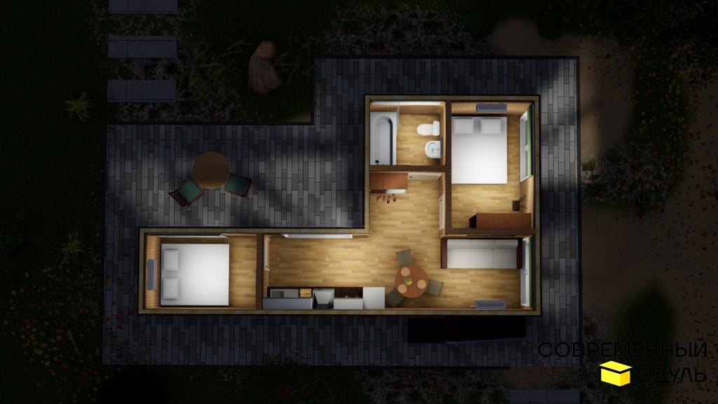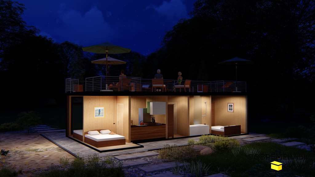 Дом из четырех модулей со сдвигом, общей площадью 50,47 кв.м. Здесь три комнаты. Большая кухня-гостиная более 25 кв.м, снабженная оборудованием для приготовления пищи. Здесь можно принимать гостей, устраивать застолья, праздники. Две почти одинаковые спальни (около 6 кв.м), санузел (5,17 кв. м) и прихожая (4,97 кв.м). За счет сдвига модулей образуется внешняя большая ниша (9,68 кв.м), ее удобно использовать для отдыха на свежем воздухе. Домик хорош для молодых семей, желающих принимать у себя друзей, устраивать вечеринки и отдыхать на природе.
