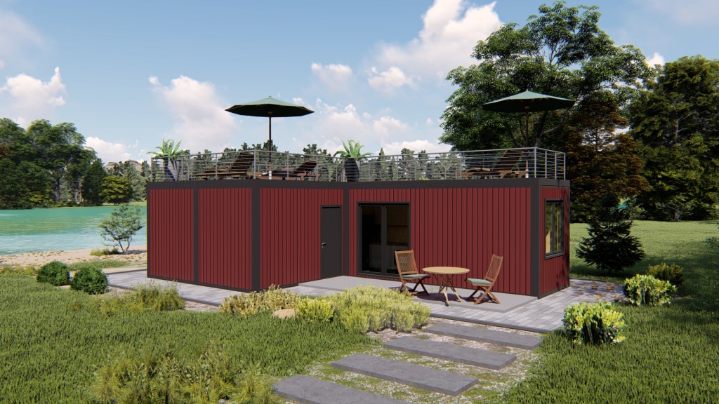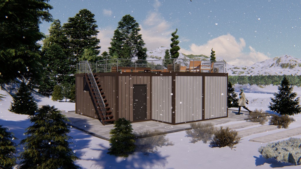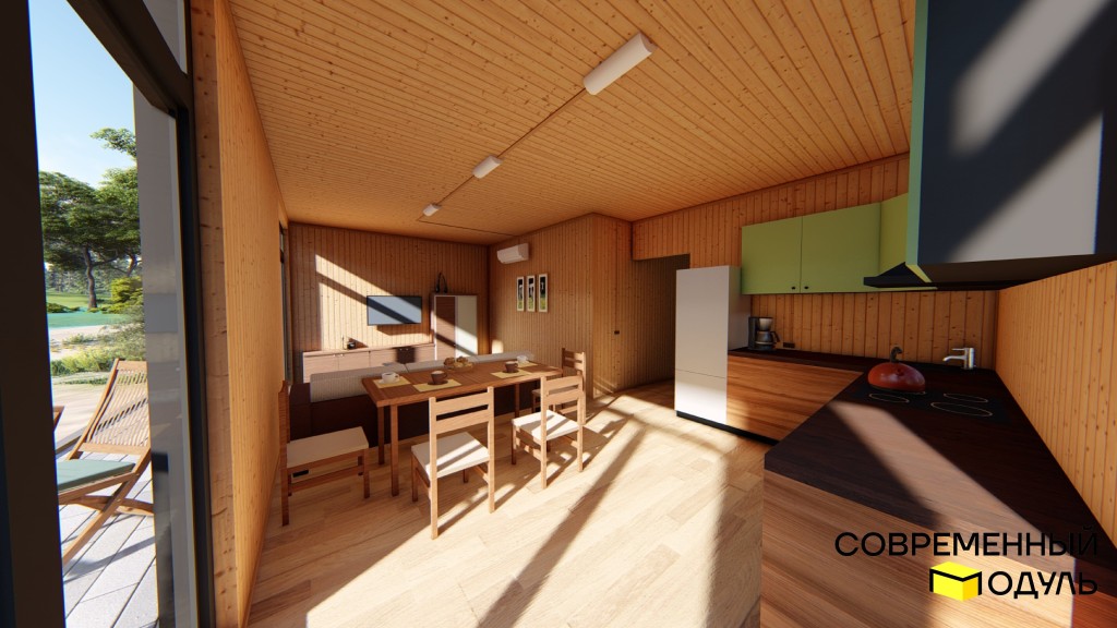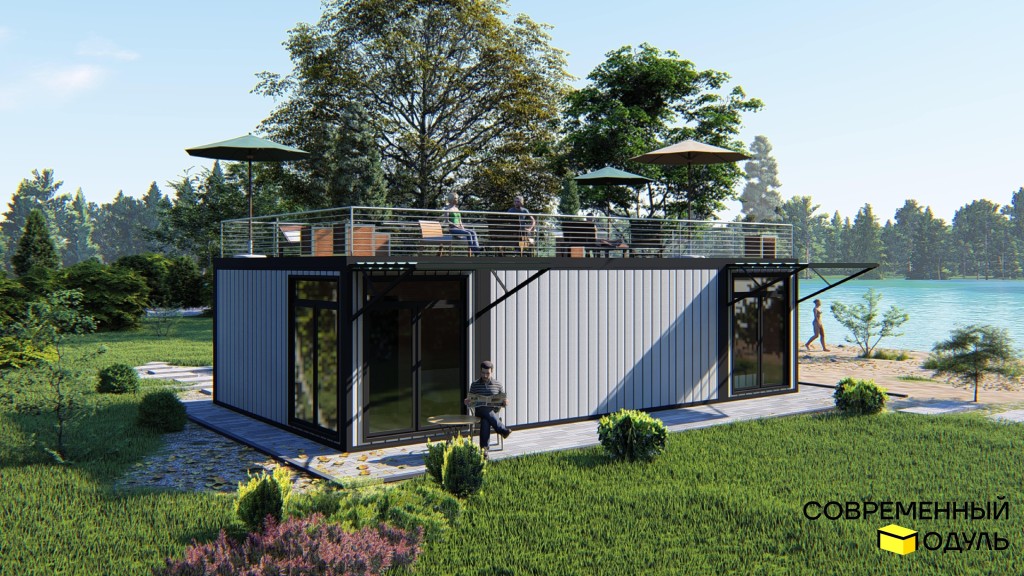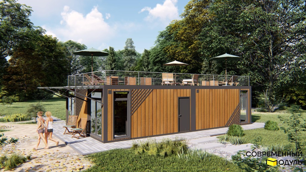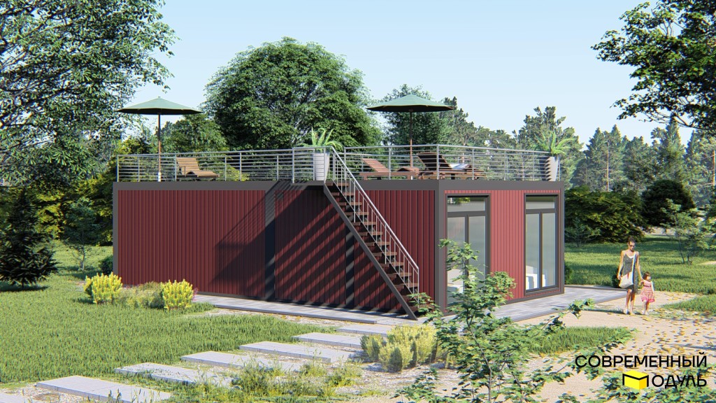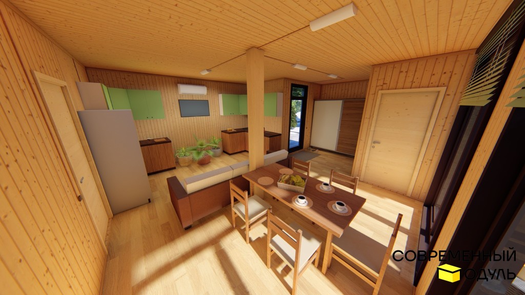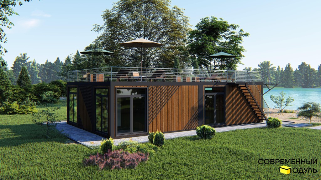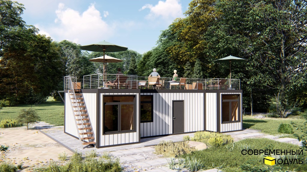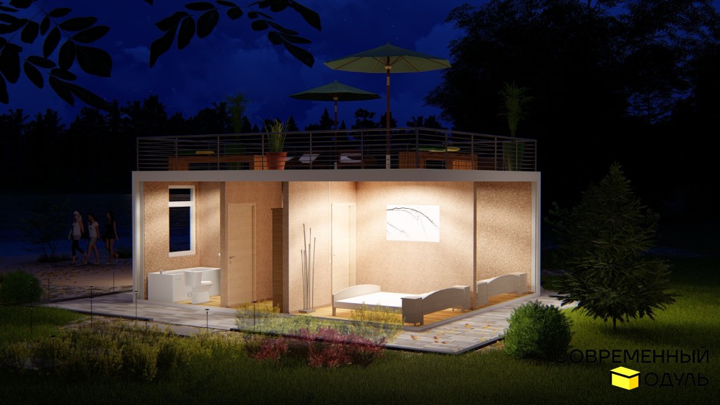Дом из четырех модулей со сдвигом, общей площадью 50,47 кв.м. Здесь три комнаты. Большая кухня-гостиная более 25 кв.м, снабженная оборудованием для приготовления пищи. Здесь можно принимать гостей, устраивать застолья, праздники. Две почти одинаковые спальни (около 6 кв.м), санузел (5,17 кв. м) и прихожая (4,97 кв.м). За счет сдвига модулей образуется внешняя большая ниша (9,68 кв.м), ее удобно использовать для отдыха на свежем воздухе. Домик хорош для молодых семей, желающих принимать у себя друзей, устраивать вечеринки и отдыхать на природе.