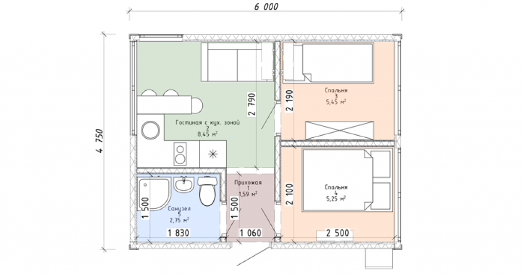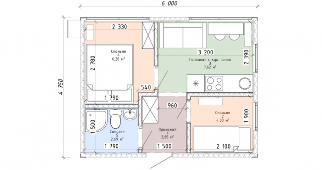 Гостиная с кухонной зоной (7,62 кв.м) – площадь небольшая, но здесь вполне умещаются и плита с раковиной, и холодильник, и обеденный стол с табуретами, и маленький диванчик. Две спальни: одна – побольше (6,36 кв.м) с двуспальной кроватью, вторая – поменьше (4 кв. м), где поместится лишь односпальная кровать. Стандартный санузел с душевым поддоном (2,69 кв.м) и маленькая прихожая (2,85 кв.м).