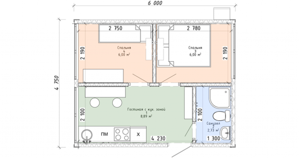 Этот вариант без прихожей, за счет чего увеличивается площадь комнаты, вход ведет сразу в гостиную-кухню (8,89 кв.м). Она более просторная, чем в первом варианте, поэтому здесь можно выделить не только обеденную зону, но и место для отдыха. Две одинаковые спальни (6 кв.м) соседствуют с гостиной. Санузел (2,73 кв.м) оборудован душевой кабиной или поддоном, раковиной, унитазом.