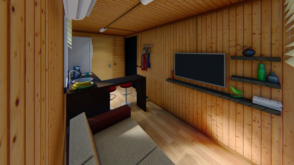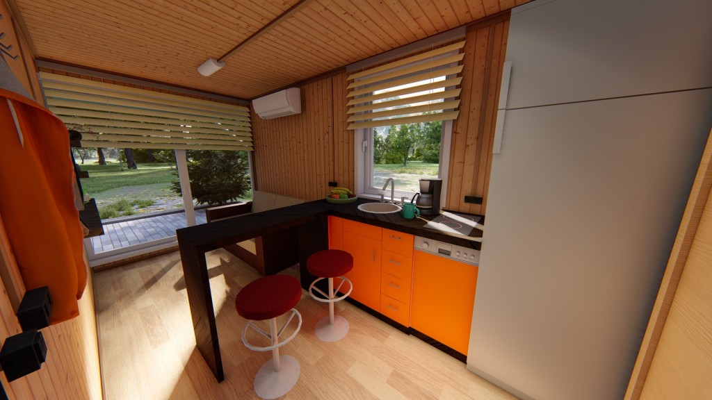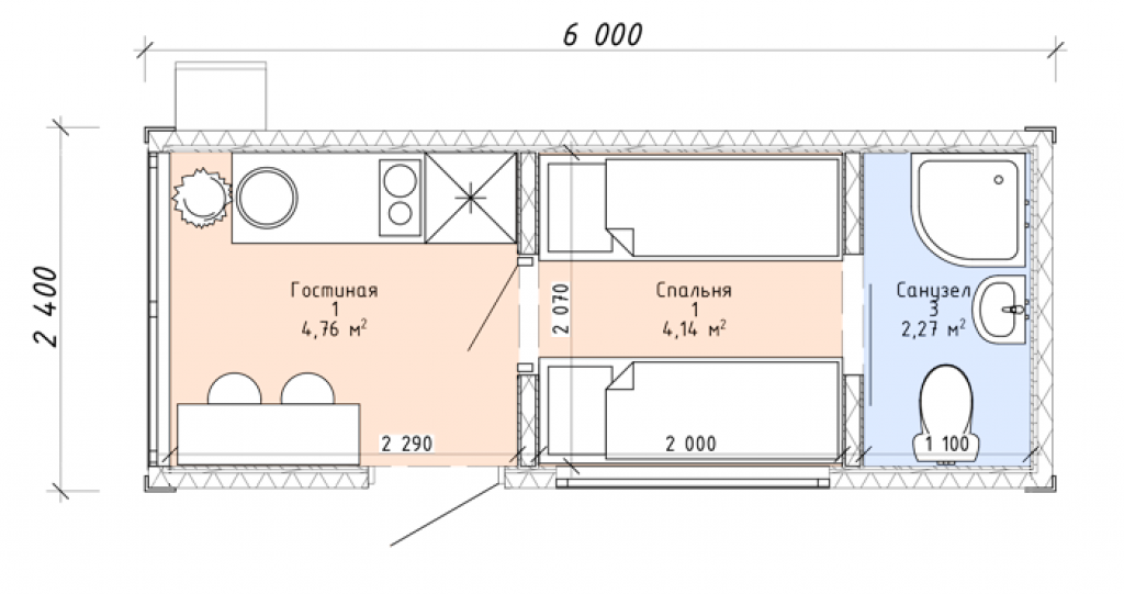 Гостиная-столовая (площадь – 4,76 кв.м), спальня (площадь – 4,14 кв.м), санузел (площадь – 2,27 кв.м). Несмотря на небольшую площадь, помещение делится на гостиную и спальню. Комнатки крошечные, но зато члены семьи будут отдыхать независимо друг от друга. Входная дверь ведет в гостиную-столовую, оснащенную кухонным оборудованием, здесь можно и готовить, и обедать. В спаленке помещаются две кровати. Дверь разделяет эту комнату с санузлом.