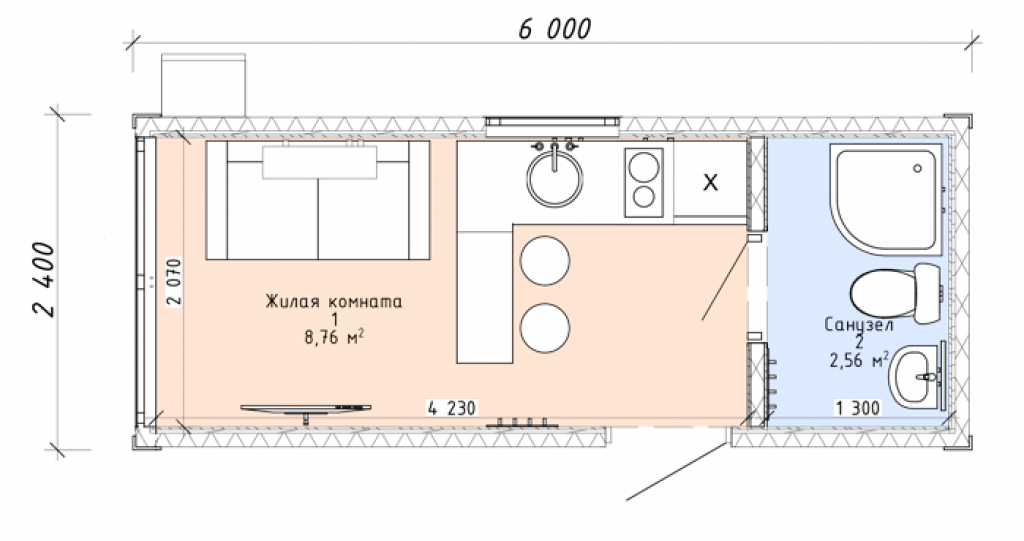 Гостиная + кухня (площадь – 8,76 кв.м) и санузел (площадь – 2,56 кв.м). Кухонный блок включает в себя мойку, рабочий стол, плиту, холодильник. От жилой комнаты отделен узким обеденным столом, за который садятся с обеих сторон. В гостиной легко размещается раскладывающийся диван, на стене – телевизионная панель, полки для мелочей. Санузел включает стандартный набор: унитаз, раковину, душевой поддон.